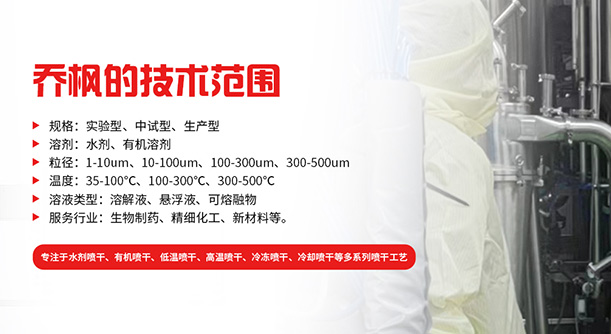 上海喬楓實(shí)業(yè)有限公司,成立于2012年,是從事噴霧干燥設(shè)備的研發(fā)設(shè)計(jì)、生產(chǎn)、銷(xiāo)售(小型噴霧干燥機(jī),實(shí)驗(yàn)型噴霧干燥機(jī)35℃低溫噴霧干燥機(jī),有機(jī)溶劑噴霧干燥機(jī),低溫閉式循環(huán)噴霧干燥機(jī)、超細(xì)粉末噴霧干燥機(jī)噴霧冷凍干燥機(jī)、真空噴霧干燥機(jī)氣流噴霧干燥機(jī),噴霧造粒干燥機(jī),離心噴霧干燥機(jī),沸騰制粒機(jī)等)和售后于一體的綜合性公司,本公司現(xiàn)成為一家致力于為生物制藥、精細(xì)化工、新能源、陶瓷造粒及食品工程等領(lǐng)域提供全套解決方案的整線交鑰匙工程企業(yè)。